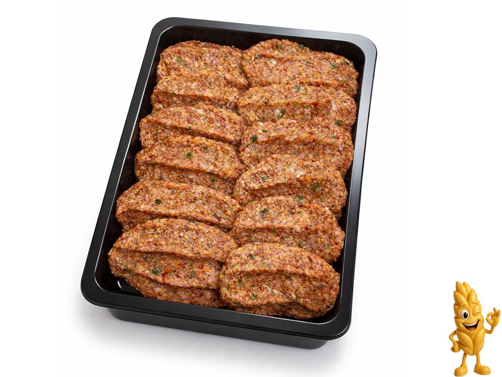 Složeni: Hovězí maso, hovězí tuk, kořeni, čerstvý petržel, paprika, česnek a cibule a rajčata, sůl.