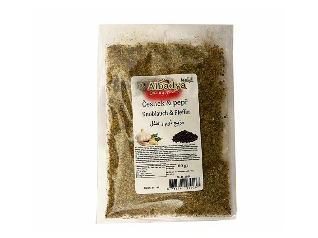 Složení: česnek, pepř, koriandr, paprika, celer, kurkuma, libeček, česnek, pikantní aroma, řepkový olej, oxid křemičity E551. Výrobek může obsahovat stopy sezamu, celeru, hořčice a lepku.