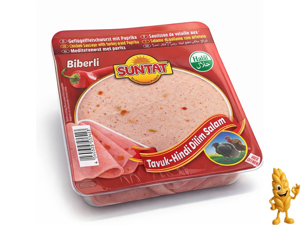 Složení: kuřecí a krůtí maso 64%, voda, kuřecí tuk s dusičnanovou solí kůže (konzervační sůl E250), bramborový škrob, dextróza, paprika 1%, koření, stabilizátor: E450 rostlinný prášek (červená řepa), kyseliny E327, E262, E330, antioxidant E300, extrakt z koření, aroma. může obsahovat stopy pistácií